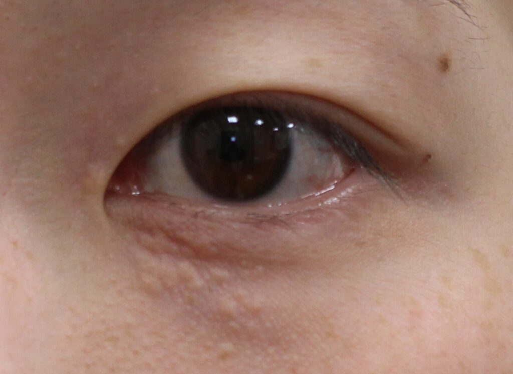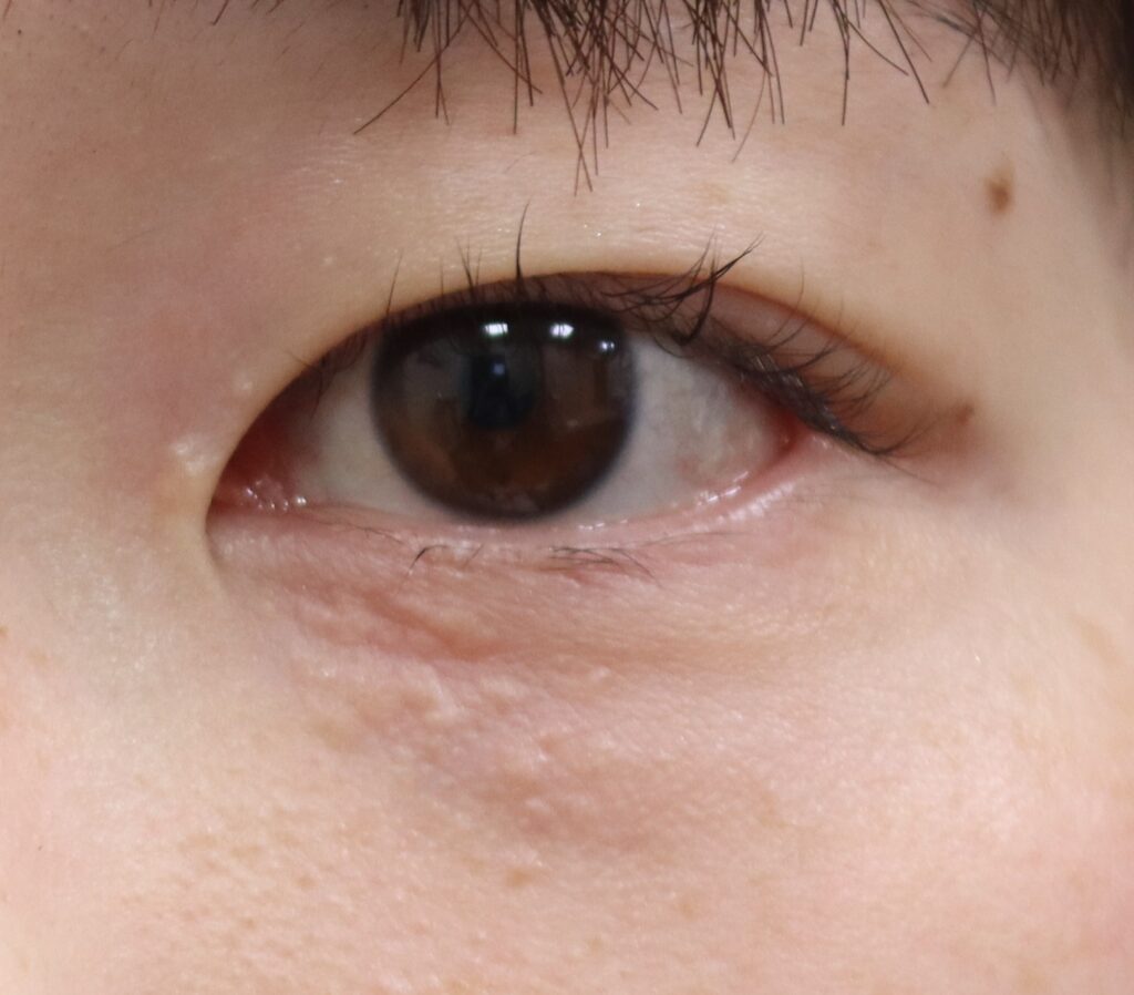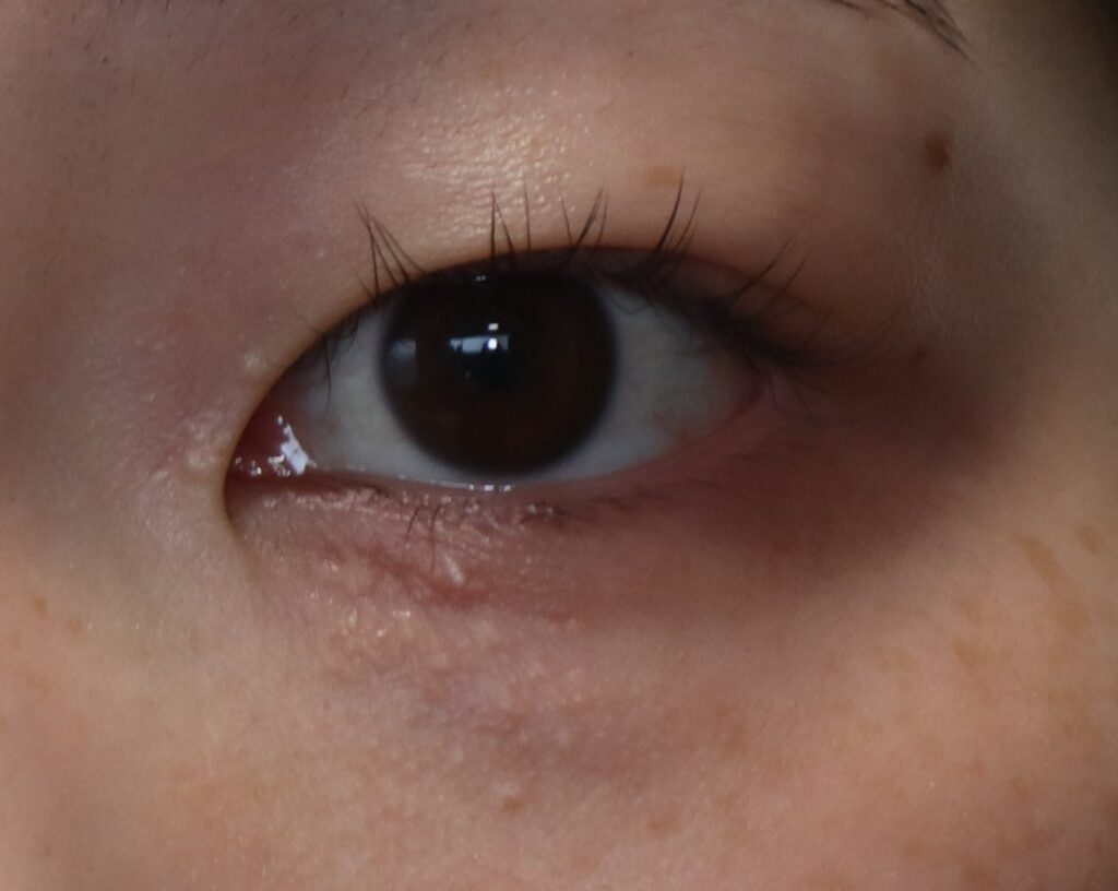 1回目の治療から約2~3か月後、2回目施術を行う直前の状態です。(写真3)初回治療から時間が経って、汗管腫のサイズが全体的に小さく縮小しているのがわかります。凸凹感が減り、メイクでかなり隠せる程度になりました。患者様ご本人も「1回の治療でも効果を実感できた」とおっしゃっています。
