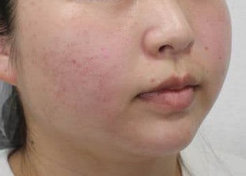 術前(令和4年12月25日:1回目治療前) – 肌全体にニキビ跡の赤みが強く残り、炎症後の赤ら顔状態になっています。