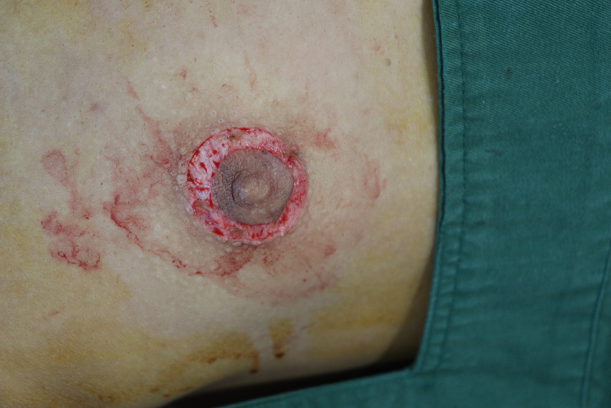 ↑ドーナツ状に表皮を剥削した直後の乳輪(真皮層が露出した状態)
