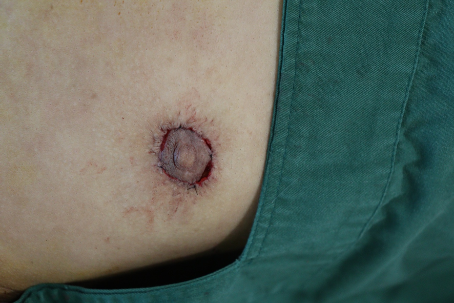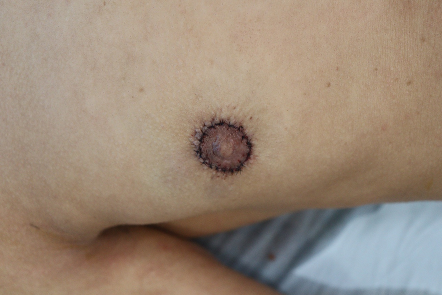 ↑術後10日目(抜糸時)の乳輪。創部は順調に回復し、膨らみのない平らな状態になっている