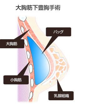 大胸筋の下にシリコンバッグを挿入する方法で、術後は強い痛みを伴いやすい。また筋肉層は血流が豊富なため剥離時に出血しやすく、血腫(血液のかたまり)のリスクも相対的に高くなります。