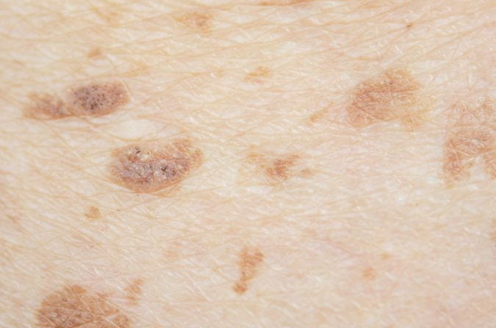 しかし、加齢に伴い増えてくる脂漏性角化症(しろうせいかくかしょう)と呼ばれる盛り上がったタイプの茶色いシミ(いわゆる「老人性イボ」)が胸に多数できている場合、多くの男性は正直言って萎えてしまいます。脂漏性角化症は「シミがイボ状に盛り上がったもの」で、主な原因は皮膚の老化と紫外線です。触るとわずかに隆起を感じる茶色い斑点で、40代以降の顔や首・胸によく現れます。
