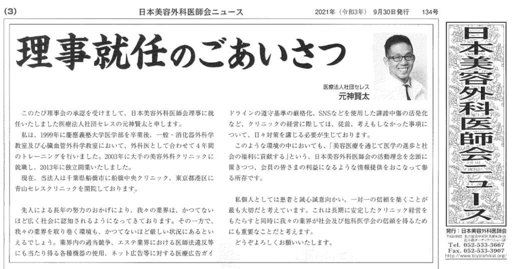 美容医師会新聞で理事就任のごあいさつ