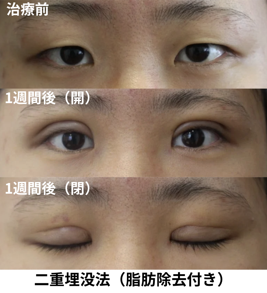二重整形の場合、施術方法によってダウンタイムの長さは多少異なります。例えばメスを使わない埋没法(二重埋没)は比較的腫れが少なくダウンタイムも短めで、早い人では数日、通常でも1週間程度で人前に出てもわからないくらいになります。