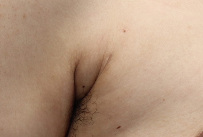 乳頭については、この時点ではまだ陥没した状態が残存していました。ただしこれは予想されたことで、術後すぐには乳頭周囲の硬縮や腫れで陥没が改善していなくても、時間とともに変化が出る可能性があります。創部(下記の写真)は抜糸を行っています。