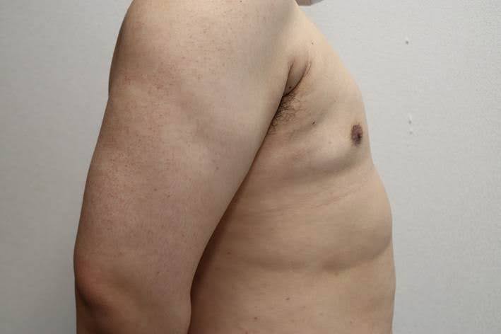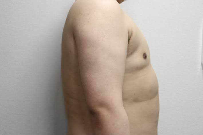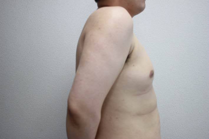 治療前の写真では、男性であるにもかかわらず両胸が女性のように丸く膨らんでいるのがわかります(右斜め前方からの画像および真横からの画像)。乳輪も肥大し、胸にしっかりとした厚みがあります。乳頭は両側とも内側に陥没しており、正面から見たとき乳首が見えない状態でした。
