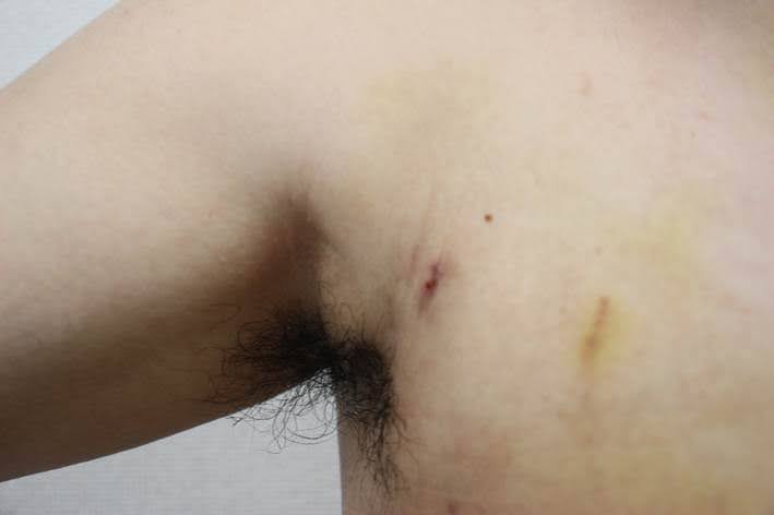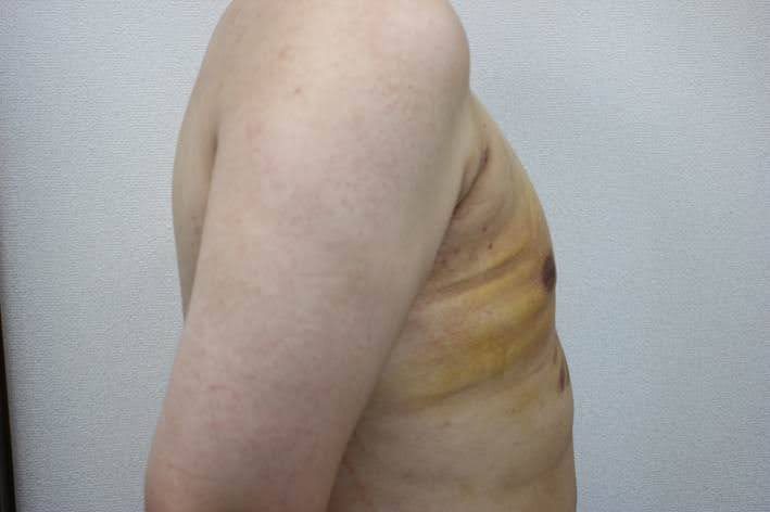 これは手術による出血が皮下で吸収される過程で生じるもので、時間とともに消えていきます。また腫れもまだ残っており、触ると硬さが感じられました。しかし、術前と比較すると胸の膨らみ自体は明らかに縮小しています。