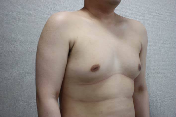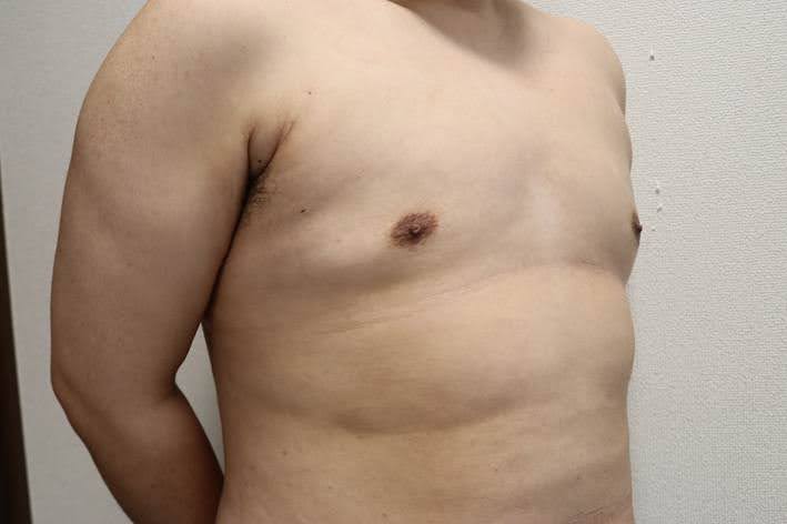 手術後3ヶ月が経過した頃の写真です(右斜め前方・真横から)。この頃になると術後の腫れ・硬さはほぼ解消し、柔らかい自然な胸板になりました。患者さんは実は術後にご自身でも食事管理や運動によるダイエットを継続され、全体的に体重が落ちたこともあって、胸の状態はさらに引き締まっています。