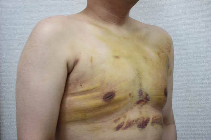 これは手術による出血が皮下で吸収される過程で生じるもので、時間とともに消えていきます。また腫れもまだ残っており、触ると硬さが感じられました。しかし、術前と比較すると胸の膨らみ自体は明らかに縮小しています。