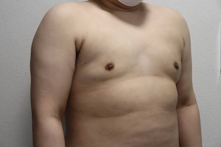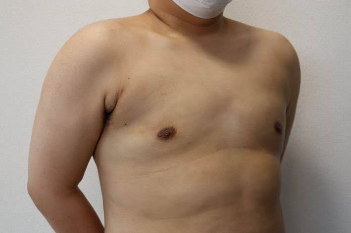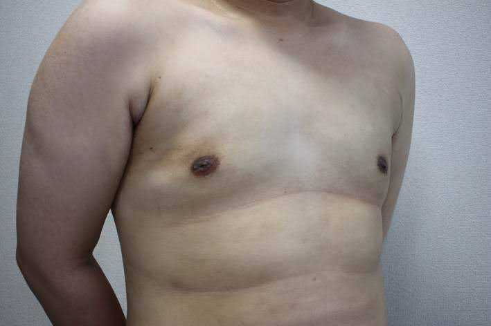 治療前の写真では、男性であるにもかかわらず両胸が女性のように丸く膨らんでいるのがわかります(右斜め前方からの画像および真横からの画像)。乳輪も肥大し、胸にしっかりとした厚みがあります。乳頭は両側とも内側に陥没しており、正面から見たとき乳首が見えない状態でした。