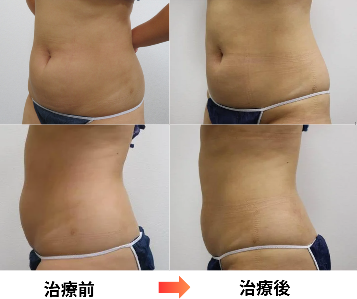 施術前の写真では下腹部全体に丸みがあり、薄手の服を着るとポッコリが目立つ状態でしたが、施術後3ヶ月の写真ではお腹の膨らみがかなり平坦化しています。特にへそ周りの脂肪厚が薄くなり、横から見たシルエットでも下腹の突き出しが解消しているのが分かります。患者様自身も「ウエスト周りがすっきりして、前に履いていたジーンズがはけるようになった」と大変喜ばれていました。