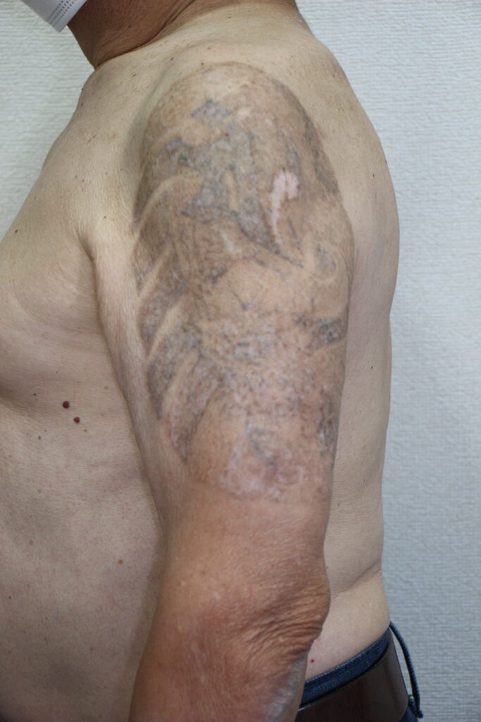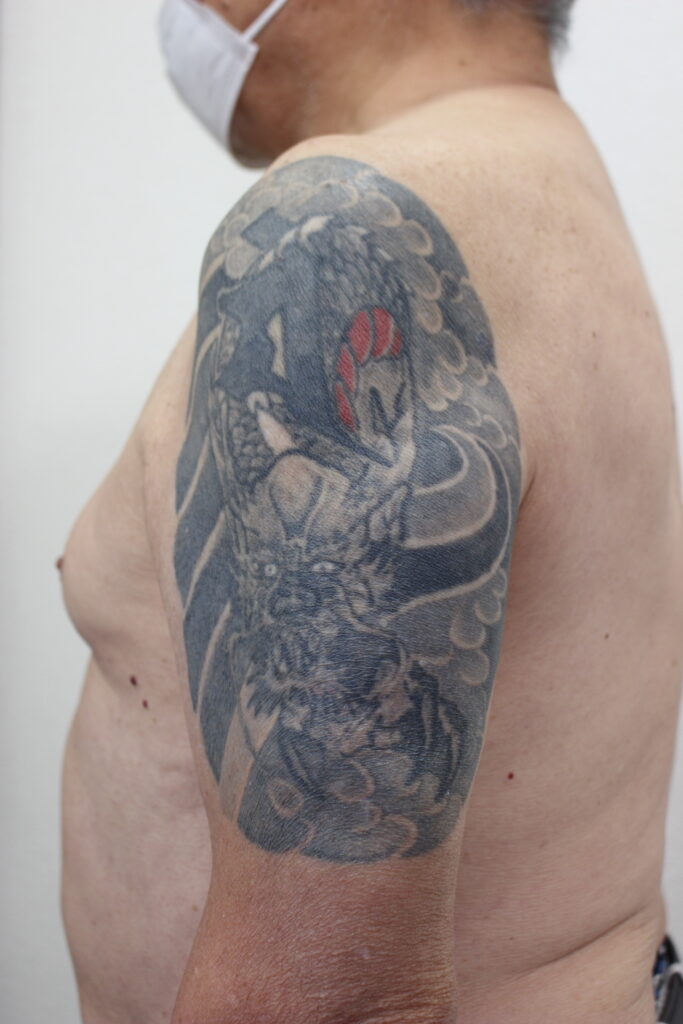 こちらがレーザー治療を始める前のタトゥーの状態です。肩から上腕にかけて龍のデザインが入った大きな刺青で、黒インクをベースに一部赤色も含まれています。長年経過したタトゥーですが、インクはまだ濃く、面積も広いため一目で非常に目立つ状態です。濃い黒色のタトゥーはレーザーで比較的反応しやすいとはいえ、これだけ広範囲で、色素が多量に含まれている場合ですと、完全除去まで10回程度の治療が必要になるケースです。