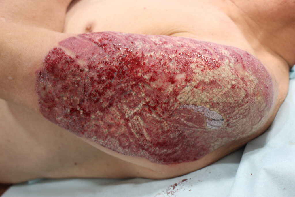 1回目のレーザーを照射し終えた直後の写真です。照射直後は皮膚表面が白く変色し、全体にわたって霜焼け状の白い霧(フロスティング)がかかったようになりますが、その直後より出血がはじまり、皮膚は全体に赤く腫れています。写真からも、タトゥーの黒いインク部分がやや白っぽく浮き上がっているのが確認できるでしょう。照射直後はこのように一時的に見た目が変化しますが、時間が経つと赤みは引き、出血も落ち着いてきます。この後は軟膏を塗ってしっかりガーゼで保護し、自宅でケアを続けていただきました。