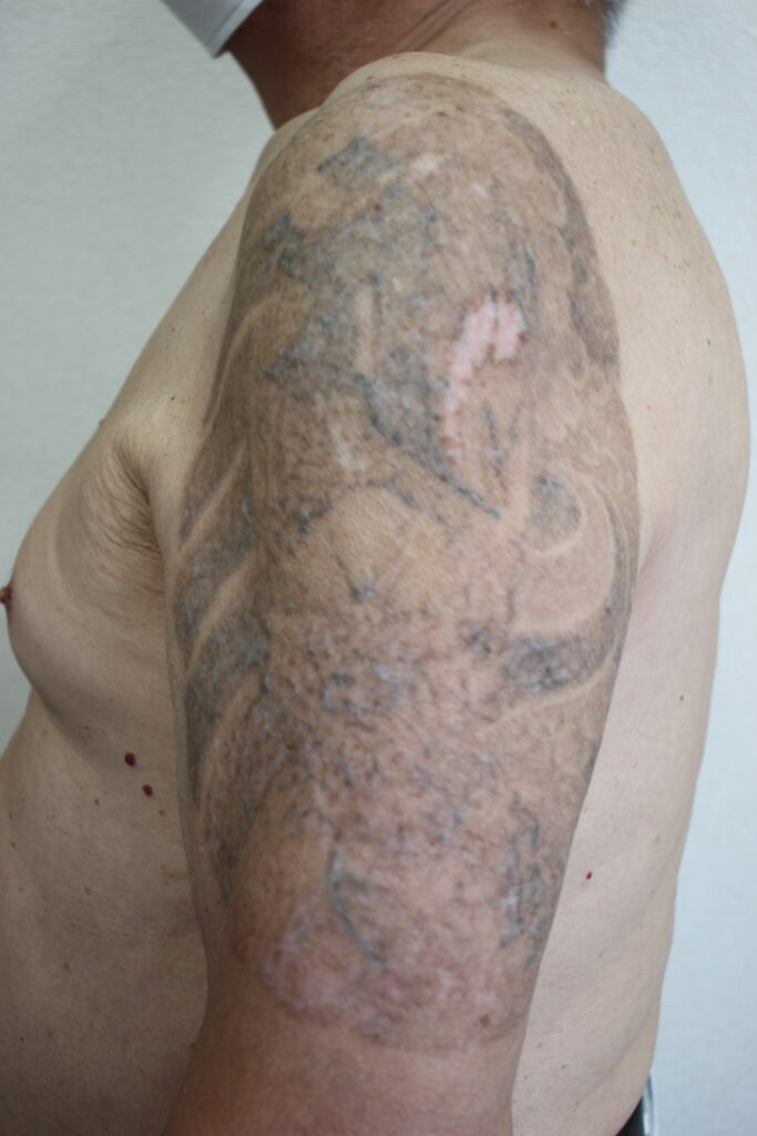 5回目のレーザー照射を終え、十分な間隔をおいてから撮影した写真です(6回目照射前の状態)。この頃になると、遠目にはタトゥーが入っていることに気づきにくいほど薄まっています。ただ、肌を間近で見ると灰色がかった影のようなインク残りがまだあります。この程度薄くなると日常生活ではほぼ気にならないものの、完全除去を目指す場合は引き続き照射を重ねていきます。