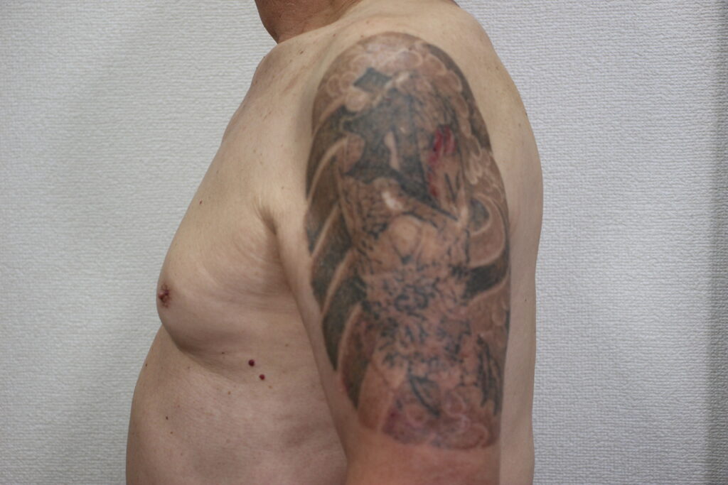 2回目のレーザー照射を行い、その約2ヶ月後(3回目照射前)に撮影した写真です。2回照射を終えたことで、タトゥーのインク量は見た目にもかなり減少してきました。特に黒い部分の変化が大きく、濃かった龍の鱗や顔の部分がかなりぼんやりとしてきています。赤い部分も薄くなり、全体的にタトゥーの輪郭が不明瞭になってきました。ただし、まだインクは皮膚内に残っている状態で、完全に消えたわけではありません。照射後の経過としては今回も順調で、2回目照射後も一時的なかさぶた・赤み以外に大きなトラブルはありませんでした。患者様は「思ったより順調に薄くなっていて安心した」とおっしゃっており、次の照射にも前向きに臨まれていました。