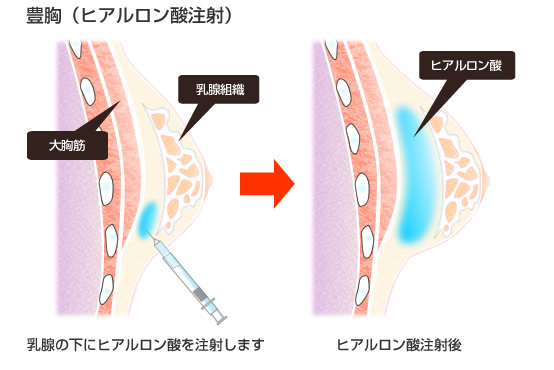 「ヒアルロン酸をバストに注射してバストを大きくする方法で、手術ではなく、簡単・手軽にできる豊胸術です。