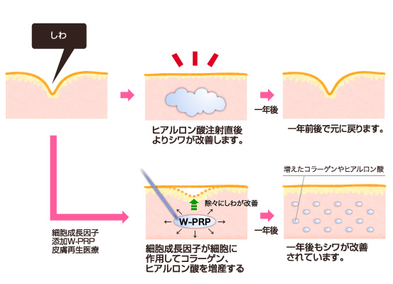 細胞成長因子添加W-PRP皮膚再生医療(セルリバイブジータ)は従来の注射治療と作用機序がまったく違います