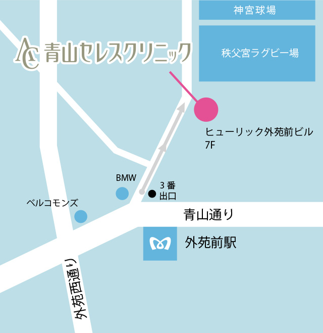 青山セレスクリニック東京青山院は、外苑前駅3番出口徒歩2分のところにあります。