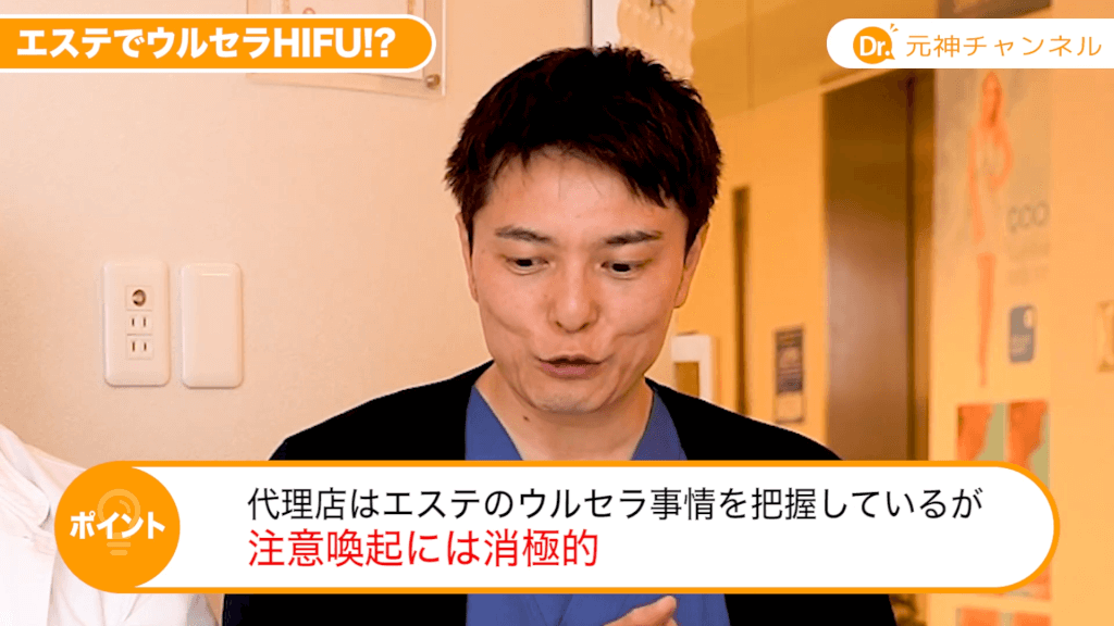 元神先生:そうですよね。HIFUの原理を使っている自体、人体に危害を与えていますからそれ自体が医療行為なんですよね。かわいそうなのはそのエステの従業員ですよね。上に言われていつの間にか違法行為をやってて警察に逮捕されるようなリスクを負わされているんですね。間違いなくそのエステティシャンも逮捕されますから。