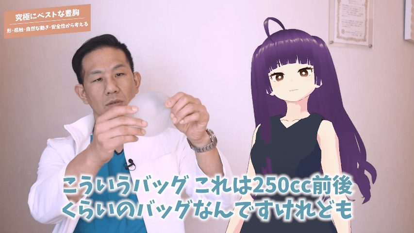元神先生:まず脂肪注入。脂肪注入もやっぱりドクターが非常に大事です。下手なドクターですとしこりになったりします。あとは入れた脂肪があまり残らないという事もあります。一般的に言うと、脂肪注入はよくて50%くらいだと思ってください。入れた脂肪の半分くらいしか残らないです。こういうバッグ、これは250cc前後くらいのバッグなんですけれども、これくらい大きくなると非常に理想ですよね。