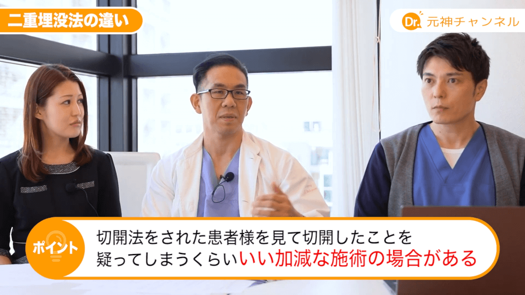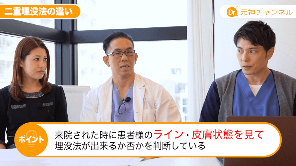 元神先生:最初の手術がどんな手術をしているかが患者さんが1人できても分からないんですけど、前のクリニックで。なのでそのラインとか皮膚の瘢痕の状態を見て、埋没法ができるかどうかは判断します。