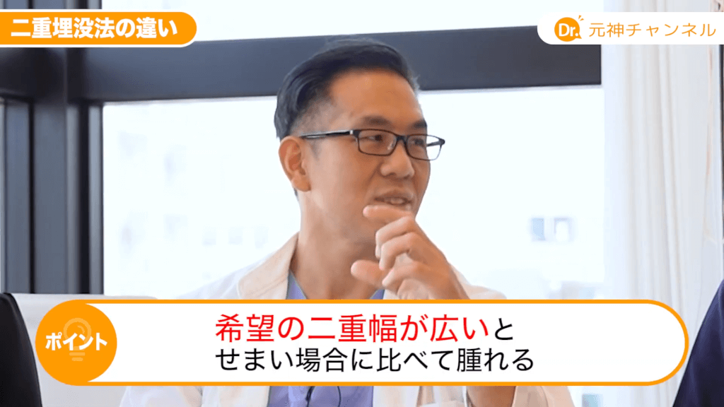 元神先生:あとは二重の幅の関係もすごくありますから。ただ最近はやはり腫れたくない方の希望が多いですので、なるべく腫れないように調整はしていますけどね、糸のかけ方とかね。しかもかつ外れにくい方法。手術も奥が深いですので日々研究していますね。