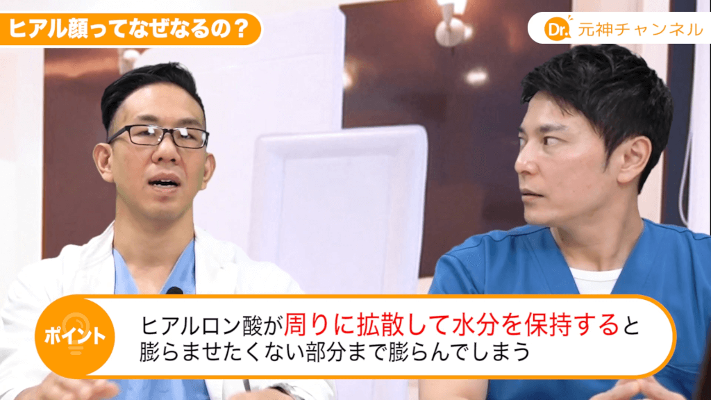 元神先生:そうですね。ヒアルロン酸も入れすぎると本来はほうれい線に入れているのに周りに拡散しているんですね。ヒアルロン酸というのは元々皮膚のどこにでもあるものなので、ちょっと移動するんですよね。入れすぎた事によって全体的に拡散しちゃってるんですよね。ヒアルロン酸というのはめちゃくちゃ水分を保持するので、身体の水分も保持した結果パンパンになっちゃうんですよね。
