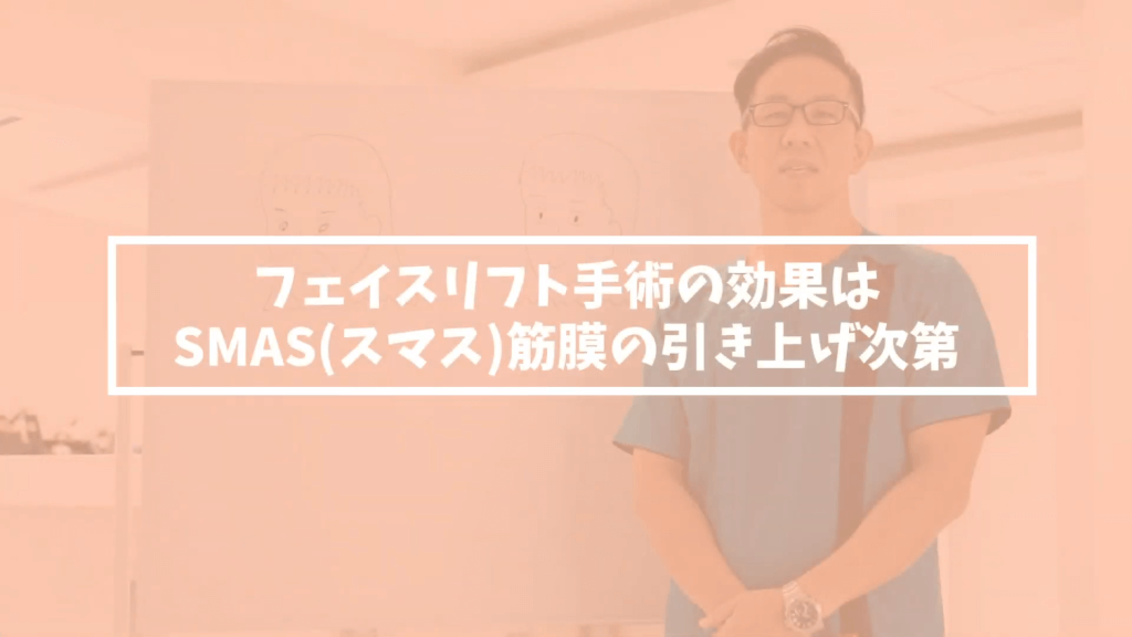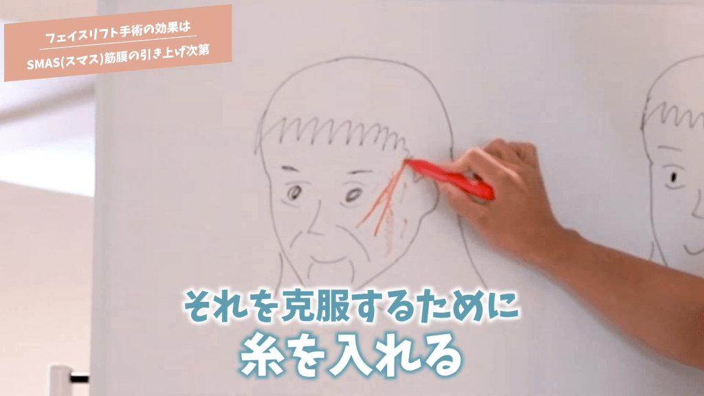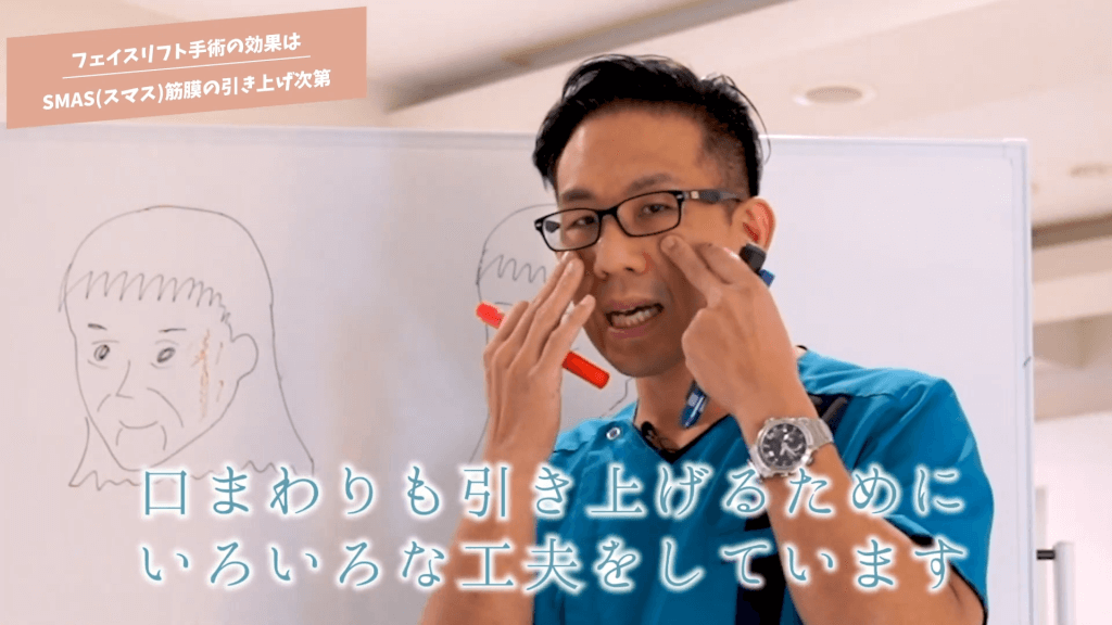 元神先生:これをしっかり上げるにはSMAS筋膜という筋膜がその下にあるんですけれども、「SMAS筋膜もしっかり引き上げる」とか、ちょっと調べると色々調べたら出てくると思うんですけど、「SMAS筋膜の引き上げ」がどこのクリニックでもやってますと言ってることが多いんですけれども、意外と引き上がってない事が多いんですよ、SMAS筋膜が。だから効果が弱かったりするんです。そこがまず1つですね。