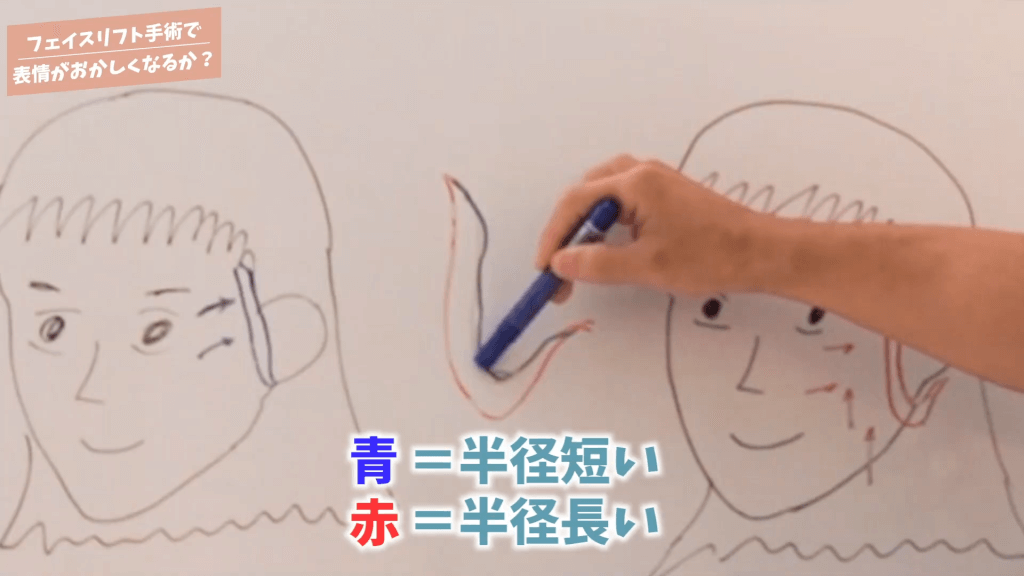元神先生:小さい傷でミニリフトとかやっちゃうドクターがいるんですけど、絶対に横方向になっていくんですよね、上に持っていけないんですよ。下の筋膜は持っていけるけど皮膚が一致しないんですよね。先ほど〝し〟みたいな感じで切除すると言いましたけど赤=〝し〟の外側と青=〝し〟その内側の長さが同じじゃないと傷が合わない。青は短い円周半径で赤は大きい円周半径なので赤の方が長いに決まってるんですね。