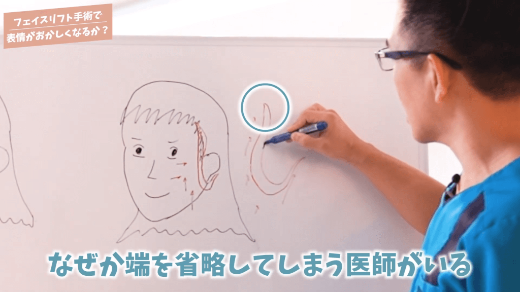 元神先生:まずその横とか変な風になる理由をお話しますと、ホワイトボードを使って説明しますけども、こめかみの高さ部分から耳の前を通り耳たぶあたりまでを切開するんですけども、先ほどお話したように下から上に皮膚を持っていくのがベストなんですね。