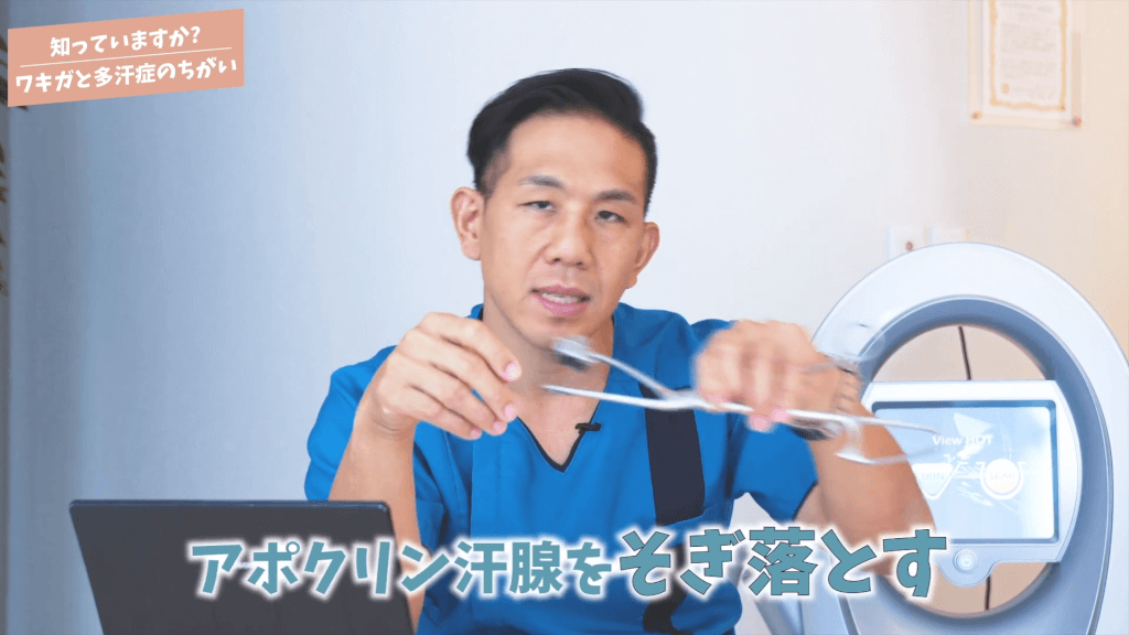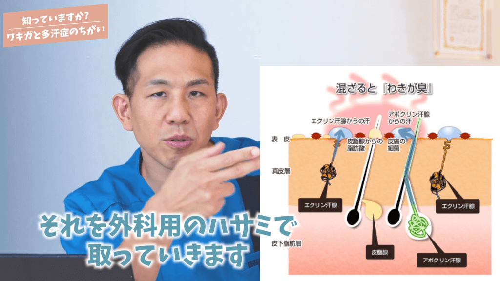 元神先生:こんにちは。ドクターの元神です。今回は非常に相談が多いワキガ・多汗症についてお話させて頂きます。まず、ワキガと多汗症って一緒に考えられがちですけど実際別物です。どうして別物かと言い切りますとですね、汗を出す分泌腺2つあるんですね!1つがエクリン腺、もう1つがアポクリン腺と言われているものです。エクリン腺というのが大量に汗を出す多汗症の原因です。もう1つアポクリン腺がワキガの臭いを出す汗の分泌腺です。原因が違いますので、一緒じゃないんですね。ですので、治療方法は両方を兼ねる場合も多いんですけども基本的には分けて考えた方がいいと思います。