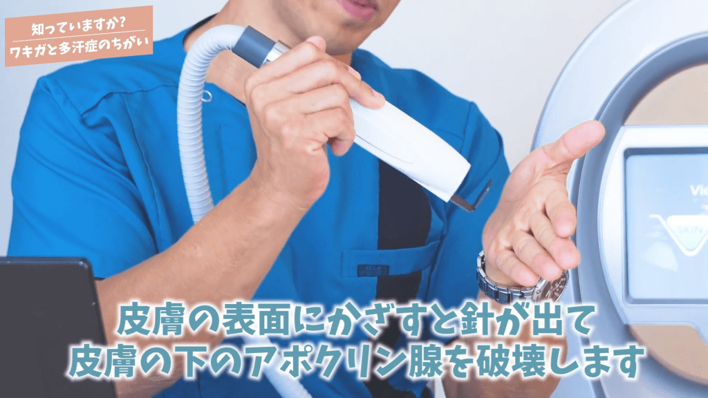 元神先生:ワキガ症の治療についてお話致します。ワキガ症はですねアポクリン腺を無くさないといけない治療になります。アポクリン腺は取り除けば再生されることはないんですね!一方多汗症の原因になっているエクリン腺はですね再生されちゃうのが厄介なところなんですね。ビューホット治療や外科的な手術でエクリン腺を取り除いても再生されちゃうんですよ!完全に再生される訳ではないので治療効果は半分くらいはあるんですよね。半分くらい再生されちゃうからボトックスほど汗をピタッと止めることはビューホット治療やどんな外科的な治療でも難しいんですね。一方ですねアポクリン汗腺は再生されません。基本的に1回取り切れば治ります。他のクリニックではミラドライといった機器とかもあると思います。ビューホット治療ではですね、直接皮膚の表面から針を刺しまして、もちろん麻酔をした上でですね!皮膚の下にあるアポクリン腺を破壊するという治療になります。これが実際のビューホットの機械になるわけですけども。これハンドピースで私の手をワキだとすると刺しまして針が出まして皮膚の下のアポクリン腺を破壊します。やっぱり手術に比べると効果が完璧ではないです。大体患者さんにお話しているのはアポクリン腺の大体7割位が1回の治療で良くなるとお話してます。