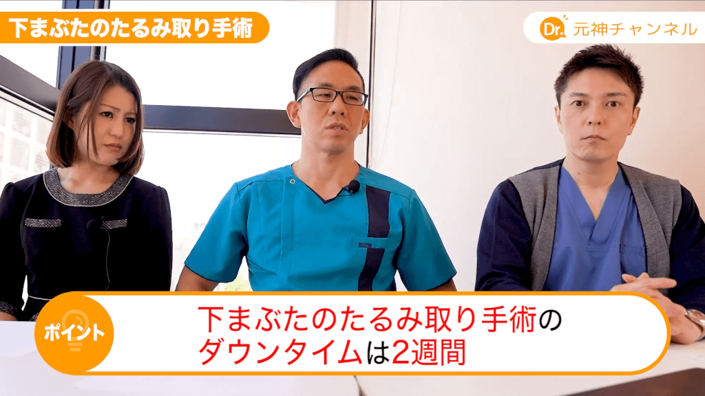 元神先生:そうですね。この手術の欠点はやっぱりちょっとダウンタイムが長いんですよね。最初はちょっとあっかんべーをしたような感じで、外反したような感じになることもありますね。ただ1~2週間くらいで大体落ち着きます。ダウンタイムはやっぱり2週間、この手術では見て頂きたいと思いますけどね。もちろん下まぶたの手術、もっとダウンタイムが少ない方法もあるんですけれども、それは先ほどお話した骨膜を固定しない方法だったりしますので、効果はやっぱり弱くなっちゃいますね。