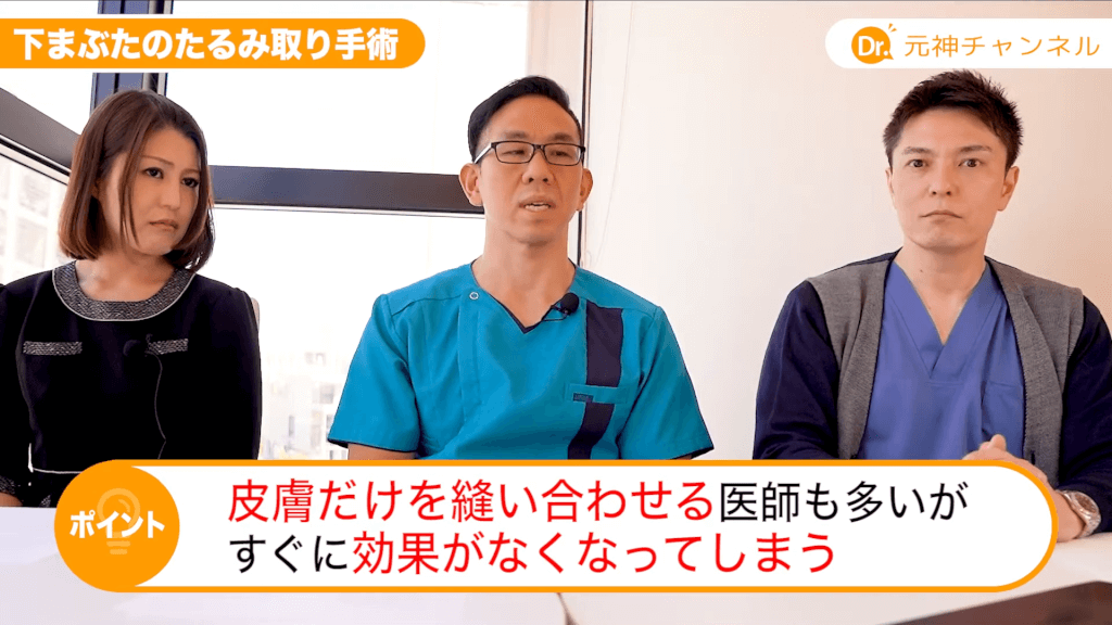 元神先生:皮膚のたるみがある場合はこの手術が1番おすすめしますね。膨らみ程度であればまぶたの裏側から脂肪を取るという事もいいとは思いますけどね。