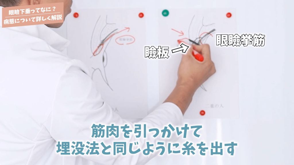 元神先生:今流行っている切らない眼瞼下垂は「じゃあ何をしているか?」と言いますと、二重の治療法で埋没法という方法がありますけれども、それと同じようにまぶたの裏側から糸をかけていくんですね。糸をかけるのが通常の埋没法というのは瞼板とか挙筋と皮膚を結ぶだけなんですね。ここだけを結ぶ事によって折り目を作ってあげているんですね。切らない眼瞼下垂というのはまぶたの裏側からこの筋肉を引っ掛けるんですよね。筋肉を引っ掛けて埋没法と同じように糸を出す。