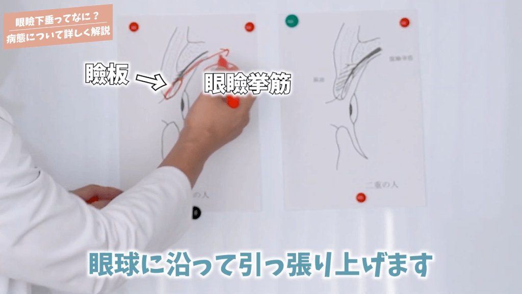 元神先生:まぶたにはシャッターがあるんですね。シャッターの役割をしていまして、そこに瞼板と言われている板があるんですね。この板の上げ下げによってまぶたが開いたり閉まったりするんですけれども、まぶたの瞼板を上げている筋肉が眼瞼挙筋なんですね。眼球に沿って引っ張り上げます。こういう矢印方向に瞼板を引き上げる事で目が開くんですね。引き上げる役割をしている眼瞼挙筋の作用が弱いんですね、眼瞼下垂の方は。治療方法としては眼瞼挙筋の作用がしっかり出るようにすればパッチリとした目になります。