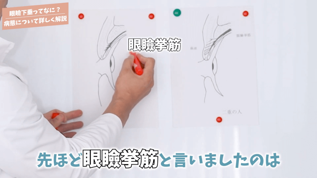 元神先生:眼瞼下垂は目を開けていると、まぶたの肉の影響で黒目が隠れている状態ですね。わずかには皆さん隠れるんですけれども、例えば半分くらい隠れるとかそういった方もいます。生まれつき眼瞼下垂の先天性眼瞼下垂という状態もあります。半分とか3分の1くらいしか黒目が出ていない状態ですね。そういった方は大体小学生くらいの時に手術が必要になってきます。一方、美容医療の眼瞼下垂というのはそこまで深刻な状態ではなくて、ただ黒目が4分の1とかくらい隠れちゃっている状態ですね。それも病気とは言えない眼瞼下垂ですけれども、大区分では眼瞼下垂と言えます。要は目がパッチリ開いていて眼烈が目の開きがいい方と、軽度の眼瞼下垂の方は何が違うかと言いますと、眼瞼挙筋というまぶたを開ける筋肉があるんですけれども、その筋肉の作用が弱いんですね。
