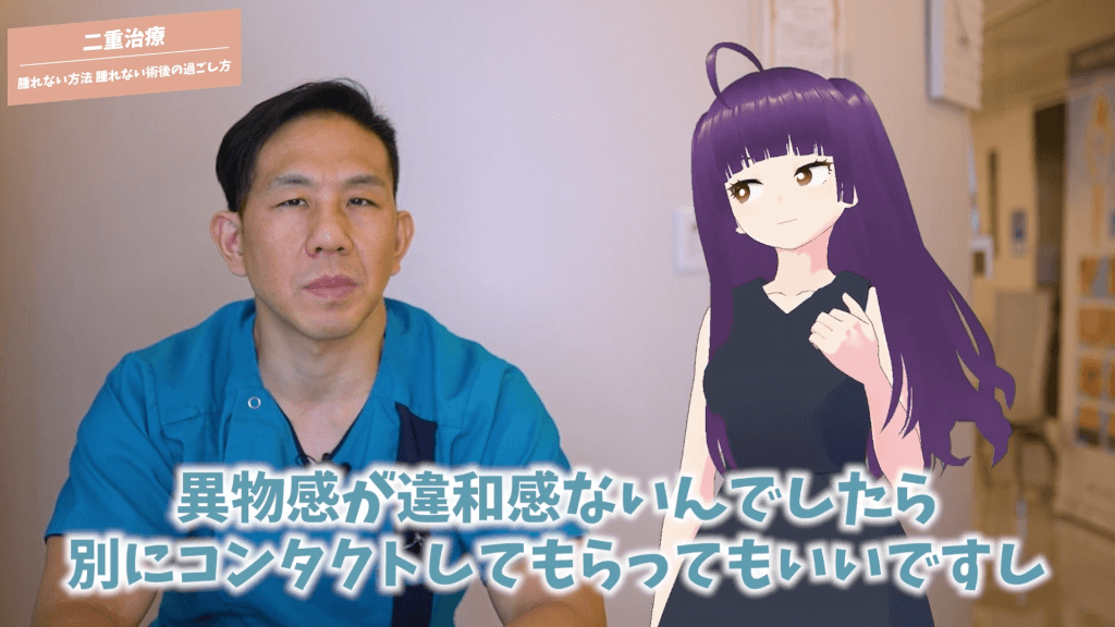 元神先生:コンタクトレンズは最初からするとすごく異物感が強くなると思いますので、その点でうちのクリニックでも3日間はコンタクトを控えた方がいいというお話はしていますけど、異物感が違和感ないんでしたら別にコンタクトしてもらってもいいですし、それが腫れとか糸の外れやすさに影響はしないと僕は考えていますね。