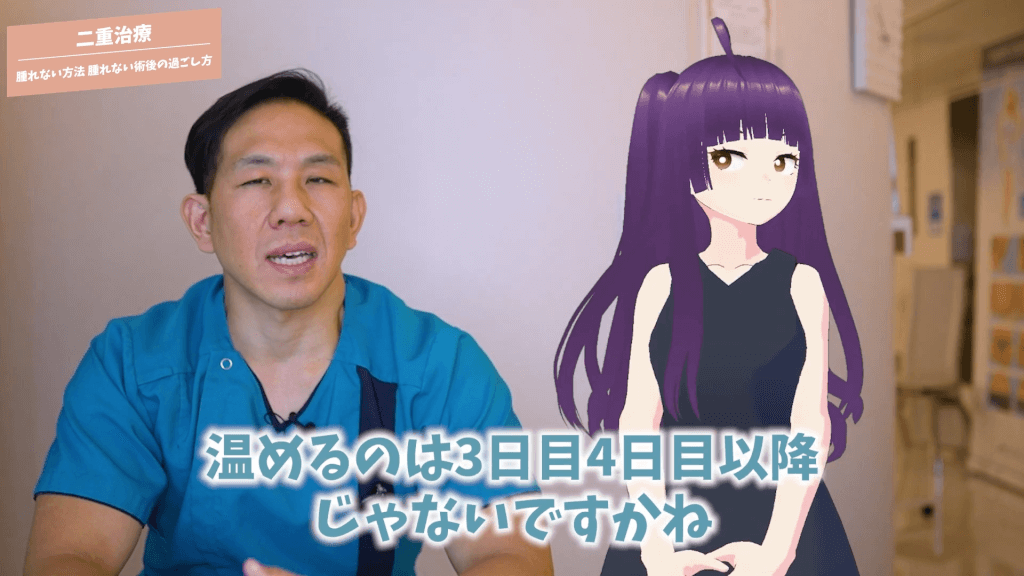元神先生:冷やすのは内出血とかがやっぱり治療直後だと出る事がありますから、埋没法でやる治療も針を通すので針穴から血が出たり、針が血管に当たって結構思わぬ出血をする事がゼロではないんですね。冷やす事で血管は収縮しますから、内出血が最小限に抑えられるという点では必要になりますけど、それが効果があるのは当日くらいなので2日目3日目に冷してもあまり意味ないですね。