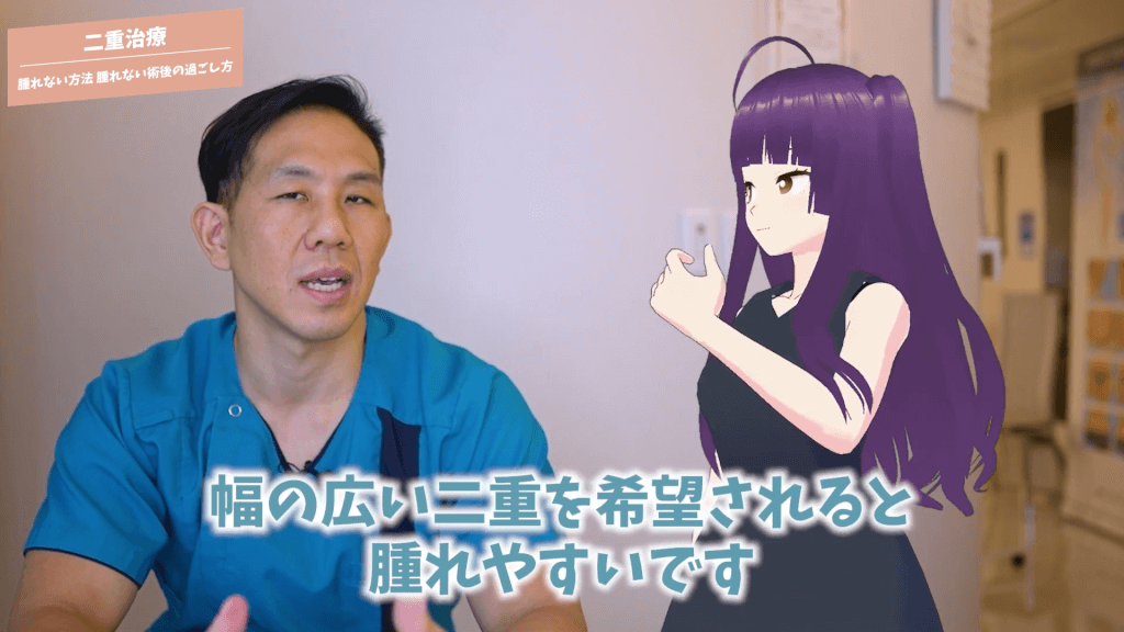 元神先生:腫れない工夫って結構難しいんですけれども、基本的な事を言うと幅の広い二重を希望されると腫れやすいです。