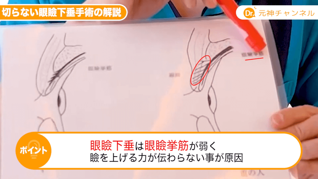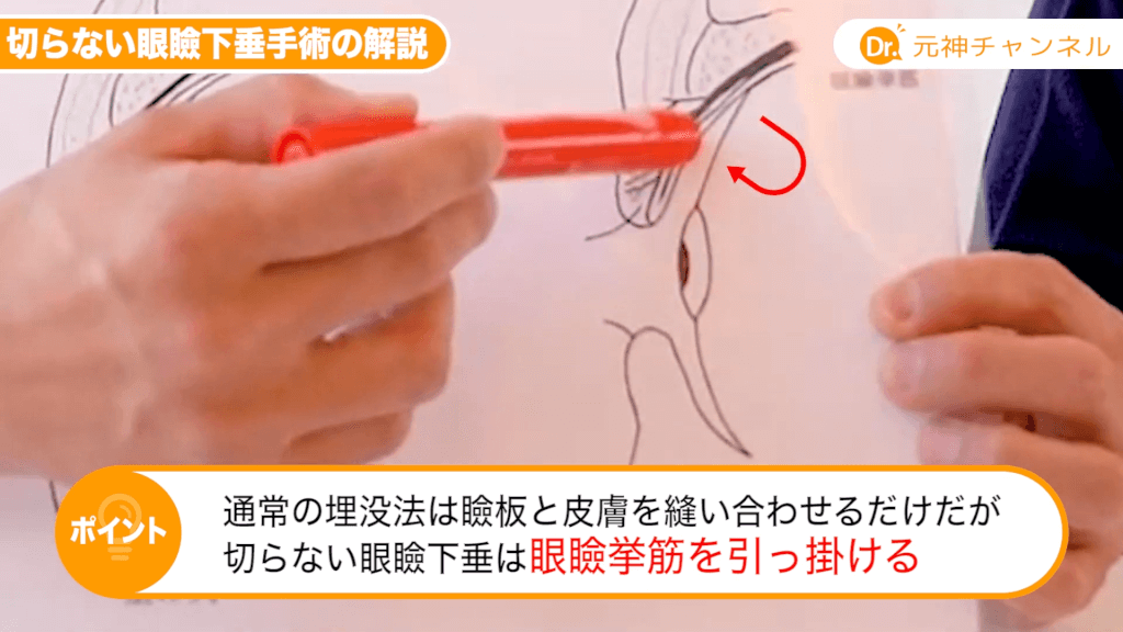 元神先生:眼瞼挙筋という筋肉が十分に瞼を開ける事に力が伝わっていないんですね。いろんな眼瞼下垂の手術はあるんですけれども、目的としては眼瞼挙筋が瞼板、瞼を開けるシャッターみたいな役割をしている瞼板をしっかりと挙げさせることが目的です。筋肉を瞼板の方に近づけさせるんですね。従来は切開をして瞼板に縫い付けていたんですけれども、この切らない眼瞼下垂治療というのは瞼の裏側から眼瞼挙筋をすくい上げて、それを瞼板の方に近づけさせる治療ですね。切らない眼瞼下垂治療も従来の切開する眼瞼下垂治療と同じことをやっています。