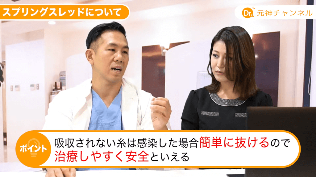元神先生:単純に溶けないからと言ってスプリングスレッドと同じような効果があるわけではないですけれども、スプリングスレッドに関して言うと非常に牽引力、先ほどお話した引き上げる力が強いです。その点が1番おすすめする点ですね。吸収される糸は持続期間が短いです。いいものでもやっぱり半年~1年くらいですかね。短いものに関しては腫れが引いた頃、1~2ヶ月後に元に戻っちゃうという事もよくありますので。どうせ糸を入れるなら僕はしっかり引き上がる糸をおすすめしますね。
