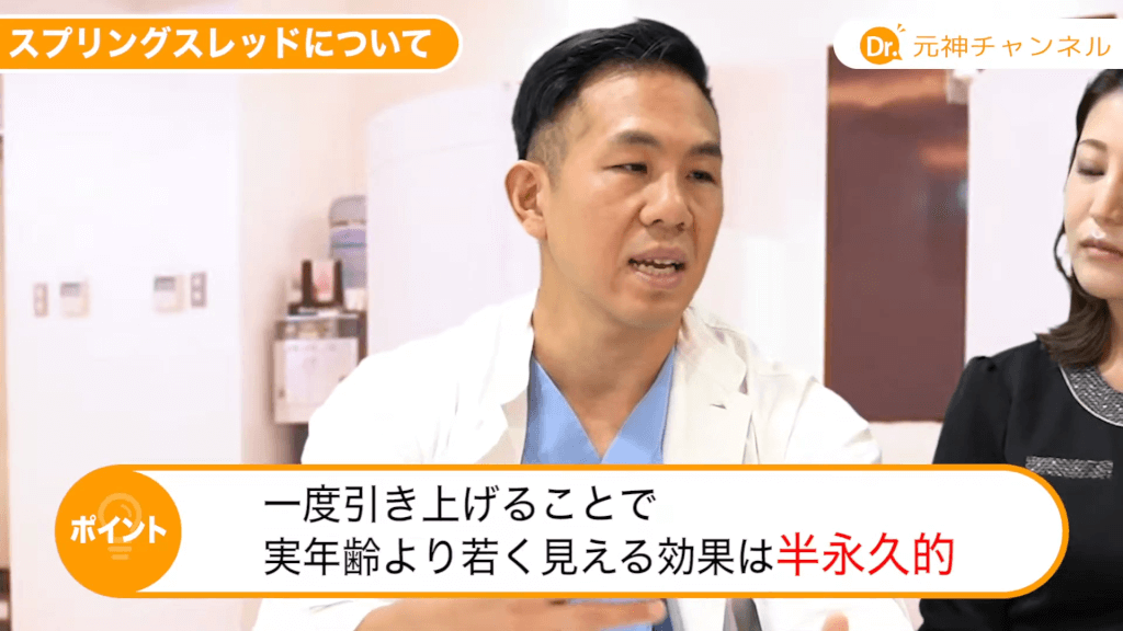 元神先生:スプリングスレッドは非吸収性で牽引する力、引き上げる力が強いのが1番の特徴ですね。もう1つは切開とかをしなくていいんですね。針で入れられますので、糸で引き上げる治療は色々な治療法があるんですけれども、切開するようなこともあるんですけれども、これは切開しなくてもいい方法ですね。