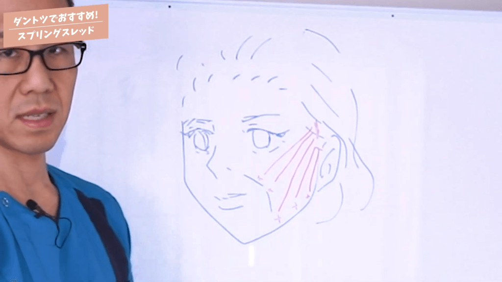 元神先生:こんにちは、美容整形チャンネルのドクターの元神です。今回は僕がおすすめしている糸のリフトでもスプリングスレッドについてお話いたします。糸で引き上げる治療にはいろんな糸がありまして、僕もいろんな糸を過去には使っています。今もある程度は種類は使っていますけれども、その中でもダントツでおすすめしているのがスプリングスレッドというものですね。どうしてそれがダントツでおすすめかと言いますと、効果がやっぱり圧倒的にあるんですよね。下から上に引き上げる力がスプリングスレッドは非常に優れてまして、すごく引き上がるんですね。従来ある世界するようなフェイスリフト手術と比較してもあまり変わらないくらい引き上がるんですよね。その点でスプリングスレッドがすごいおすすめです。