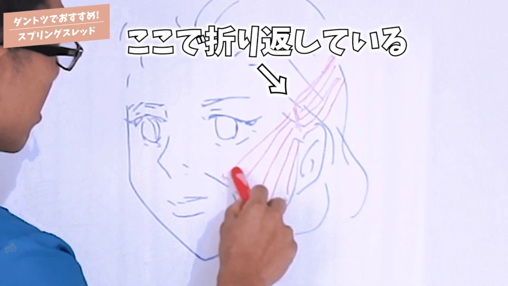 元神先生:髪の毛の中に同じ分だけ同じ糸なんですよ。1本の糸が非常に長くて両側に針がついているんですね。ここから片側を入れて、もう片側はここから入れます。髪の毛の中の皮膚の下というのは筋膜があって、そこにスプリングスレッドがしっかり固定されるんですね。だから効果があるんですね。筋膜は衰えないというか下がってこないんですよね。皮膚とか皮膚の下の組織は非常に柔軟性がありますからすぐたるんだりするんですけれども、分かると思うんですけどここ(頭皮の下)は固いじゃないですか。そこに糸が上側が固定されるんですね、この糸が。その点がスプリングスレッドが非常に優れている点なんですよね。吸収されない糸で引き上げるものもありますけれども、多くはここで折り返しているんですよね。
