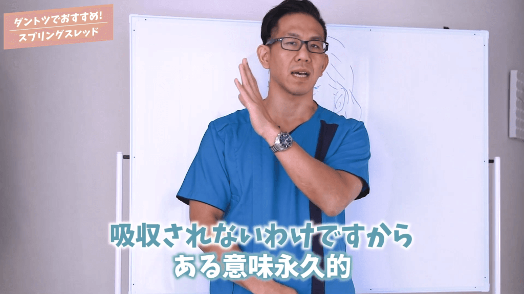 元神先生:皆さんかなり気にされるのが「糸が吸収されるのか?吸収されないのか?」という点なんですね。吸収された方が安全と思いがちなんですよね、皆さんね。スプリングスレッドに関して言いますと、吸収されない糸です。「吸収されないから怖い」とか思いがちなんですけれども、全然違うのでこの説明をしっかり聞いてください。吸収される糸というのは糸が溶けるんですよね。大体3ヶ月~半年くらいでなくなっちゃいます。3ヶ月~半年くらいで効果もなくなっちゃうんですよね。当初は吸収される糸でも3ヶ月~半年くらい糸が入っていれば、その間に「ご自身の組織がそれに入れ替わって牽引力が維持される」という説明だったんですけれども、実際はもっと短いです。1~2ヶ月くらいで効果がなくなっちゃう場合がほとんどなんですよね。患者さんの満足度も「最初は良かったけどすぐ効果がなくなっちゃった」とか、そういう感想しか聞かないですし、僕が吸収される糸をやらなくなってからもう結構長いんですけれども、他のクリニックで吸収される糸をやって3ヶ月で効果がなくなったとか、半年でなくなったというのは今でもよく聞きますし、吸収される糸も新しい糸がどんどん出ていますし、他のクリニックでやったという患者さんがいらっしゃるんですけれども、新しい糸でもやっぱり「持続性」という点では非常に短いですね、吸収される糸に関してはですね。一方吸収されない糸、僕が1番おすすめしているスプリングスレッドに関して言うと、自信を持って「最低2年くらいはしっかり引き上がってる」と言えますね。これは「吸収されないから」なんですよね。吸収されないから一度引き上げた牽引力というのはずっと維持されます。ただ年月が経つと何もしていなくても皮膚はたるむじゃないですか。それと同じで2年くらい経つとまたちょっと気になりだすという点では患者さんには「大体3年前後くらいでまたちょっと気になるから追加の治療とかをしたほうがいい」という事はお話していますけれども。上に牽引されているという点では吸収されないわけですからある意味永久的ですね。時間と共にたるみが出てきちゃうのはしょうがないという事ですね。