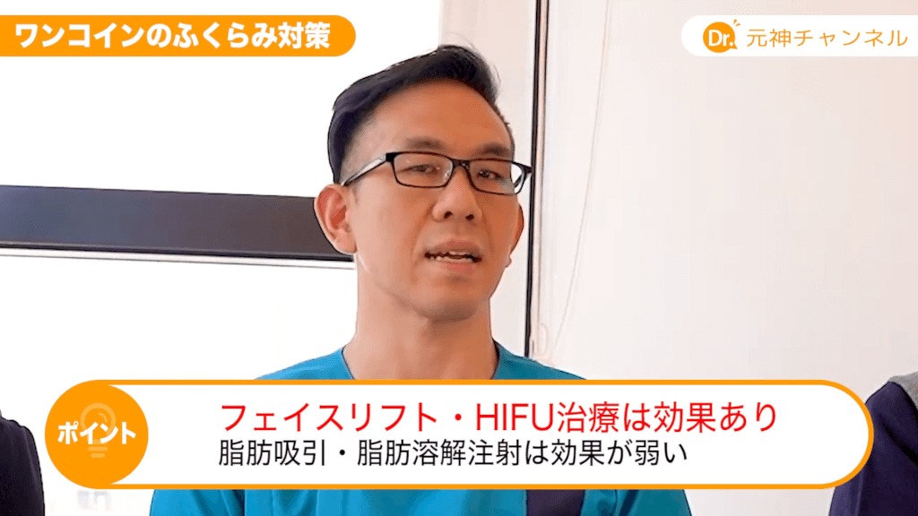 元神先生:1番いいのは糸で上げるか、フェイスリフト手術ですね、間違いないのは。ここで行っているウルセラという強力なHIFUであればある程度は上がります。脂肪吸引とかは少し効果はありますけど、脂肪溶解注射とかはちょっと効果が弱いと思いますね。