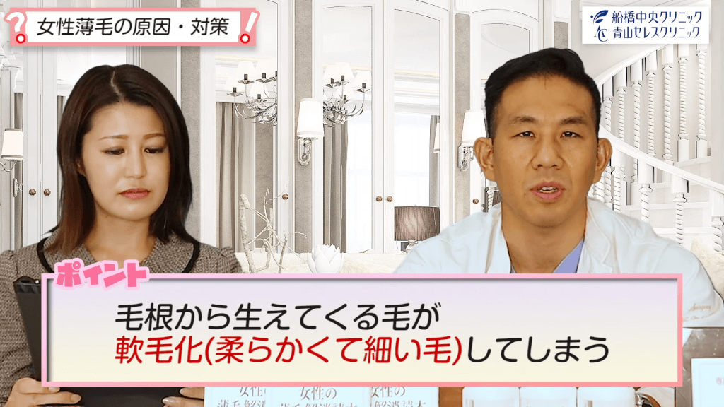 元神先生:女性は男性と違って本当にツルツルになる事はないんですけれども、どちらかと言うと毛根から生えてくる毛が軟毛化と言って柔らかく細い毛になっていくんですね。男性のツルツルのところは毛根自体が死んでしまっているような状態なんですけれども、そういう状態ではなくて毛根は生きてるけど細い毛しか生えない状態が多いですね。それがFAGAという状態なんですけれども。