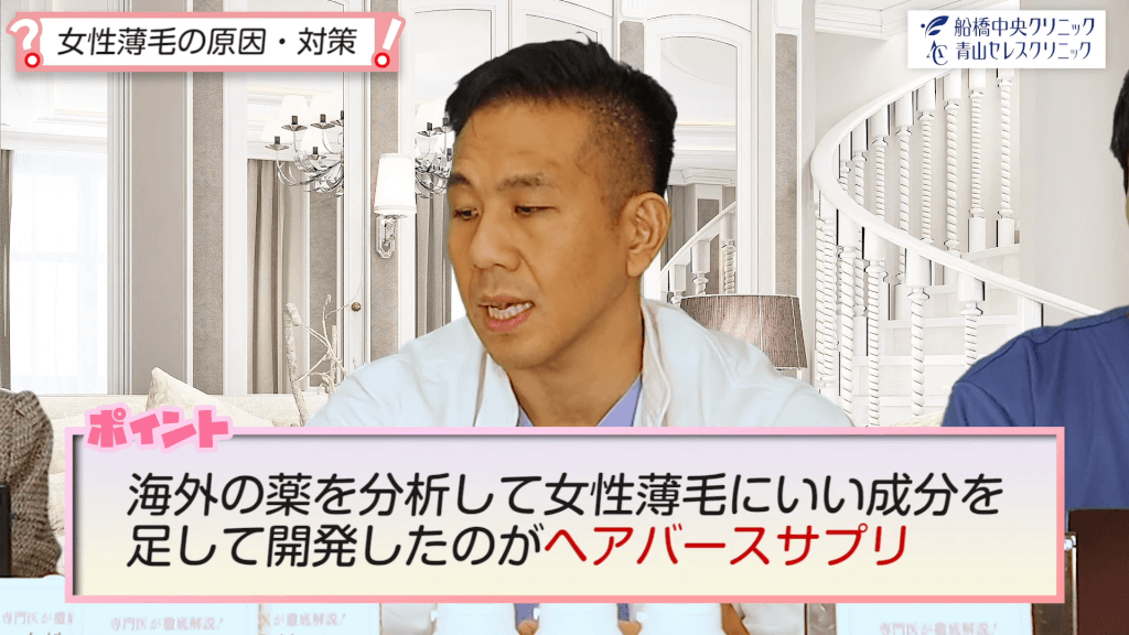 元神先生:サプリですね、ヘアバースサプリと言うんですけど、これは非常に効果がありますね。ゼロから僕が開発したのではなくて海外にこれに似たようなお薬があるんですね。ただ成分としては薬なので日本では薬として開発する事は可能ですけれども、サプリとしてはその成分ではそのままは販売できないものですから、色々分析しましてさらに女性の薄毛にいい成分を足して開発したのがこのサプリですね。このサプリに切り替えてから結構経つんですけれども非常に好評ですね。非常に効果あります。それが1つですね。