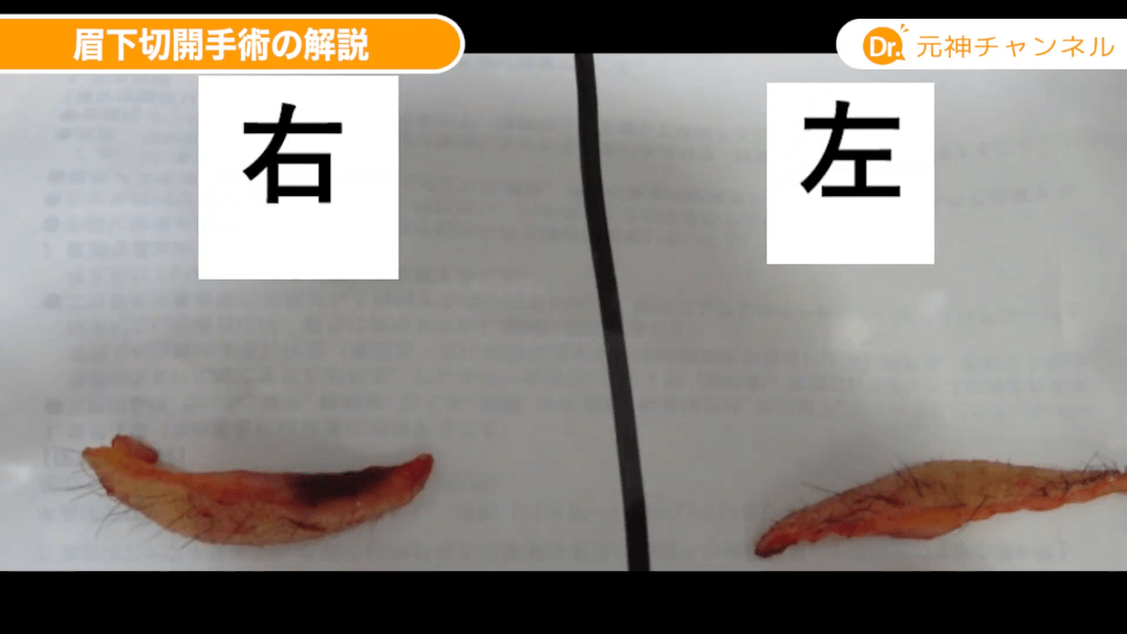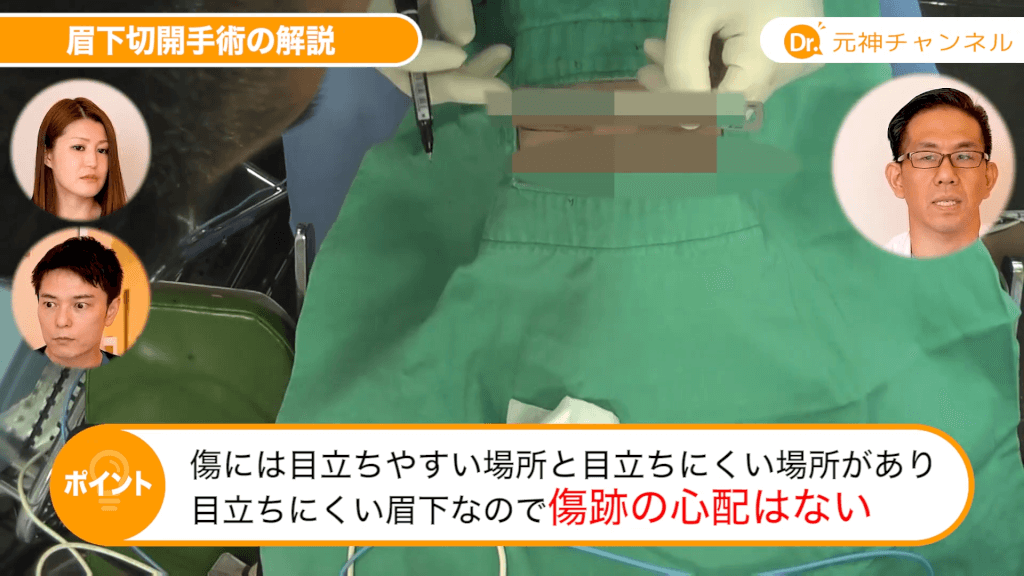 元神先生:これはたるみの程度によって皮膚の切除部分というのはだいぶん変わってきます。ポイントは眉の真下のところに切開線がきますので、これは時間が経てば眉下というのは全然目立たないところなんですよね。傷というのは同じ皮の中でも目立ちやすい場所と目立ちにくい場所がありまして、そういうところを選んで眉下の傷が目立ちにくいところを選んで切開しますので、傷跡が目立つとかそういう心配は手術後する必要はないですね。